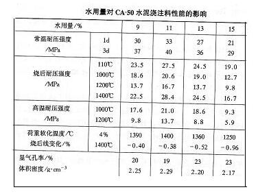 鋁酸鹽水泥品種不同,配制的耐火澆注料也不同。同一種水泥,也能配制成多品種的耐火澆注料。在耐火澆注料配合比和工藝條件相同時(shí),其水用量對(duì)耐火澆注料性能影響規(guī)律是基本相同的。現(xiàn)以CA-50水泥高鋁質(zhì)耐火澆注料為例,其水用量對(duì)澆注料性能的影響是至關(guān)重要的。耐火骨料和粉料均為二級(jí)礬土熟料,骨料<15mm的統(tǒng)料70%,粉料和水泥各位15%。成型初凝后潮濕養(yǎng)護(hù)1d拆模,然后進(jìn)行標(biāo)準(zhǔn)養(yǎng)護(hù)2d,檢驗(yàn)各種性能。從表中看出,澆注料隨水用量的增加,各種性能普遍有較大的下降:常溫耐壓強(qiáng)度降低27%~35%,烘干耐壓強(qiáng)度降低到19.1MPa,燒后耐壓強(qiáng)度由1400℃將至1250℃,燒后線變化由—0.38%降為—0.96%,顯氣孔率由19%增值23%,體積密度由2.29g/cm³降至2.17g/cm³。這就是水,配置鋁酸鹽水泥耐火澆注料時(shí),水用量(或水灰比)的選用十分重要。當(dāng)水用量多時(shí),加熱后水分逸出,孔隙增多,結(jié)構(gòu)疏松,致使各種性能全面降低。因此,在保證其施工和易性的條件下,應(yīng)盡量減少拌和物的水用量。在不摻減水劑的前提下,鋁酸鹽水泥耐火澆注料的適宜水用量為10%~13%。