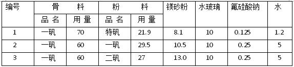 鋼包鋁鎂澆注料的耐火骨料,一般用特級,一級或二級礬土熟料,其最大料徑為15~17mm,顆粒級配:>10㎜,27%10~5㎜,39%:5~3㎜19%:3~0.09㎜,15%:耐火粉料用特級或一級礬土熟料制取,細度為小于0.09㎜的站95%以上:水玻璃模數為2.8~3.3,密度為1.4~1.45g/cm3,另加2%~5%的潔凈水,實際配料試水玻璃密度約為1.33g/cm3:采用氟硅酸鈉作促凝劑,其用量占料總質量的0.08%~0.3%,沒啥分鐘MgO>90%,其細度為小于0.09㎜的應大于95%。鋼包鋁鎂澆注料的通用配比見表