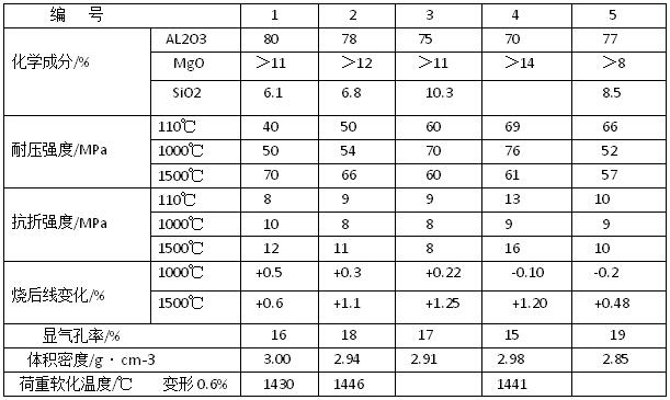 超微粉結(jié)合鋁鎂尖晶石質(zhì)耐火澆注料用的耐火骨料,主要是山西特級礬土熟料,AL2O3與TiO2合量約為90%,臨界粒徑約為25mm,一般采用連續(xù)顆粒級配,也有用間斷級配的:結(jié)合劑為活性SiO2超微粉,SiO2大于91%,中直徑D5O約為3μm,另加聚磷酸鈉等分散劑和快干劑。其性能見(下表)。基質(zhì)中均加較高檔次的鋁鎂尖晶石粉、剛玉粉和α-AL2O3超微粉。表中編號1添加電熔鎂砂粉,用量約為9%:編號2添加高純鎂砂粉,編號4添加MgO約為94%的燒結(jié)鎂砂粉,編號3、編號5和編號6則為中檔鎂砂粉。其細度均不大于0.088mm。