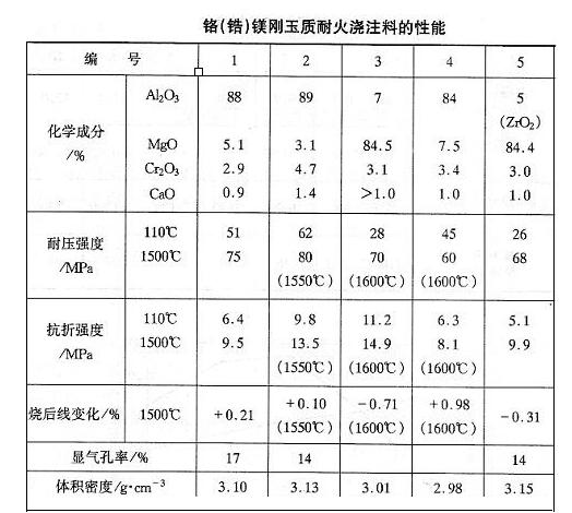 (表)鉻(鋯)鎂剛玉質耐火澆注料的性能