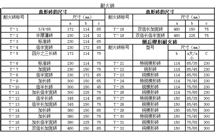 耐火磚的型號(hào)比較多最常用的分類型號(hào)有:直形磚、豎楔型磚,側(cè)楔形磚、輻射形磚、拱角磚、枚磚等按照型號(hào)代碼分為:T R D G 等型號(hào)代碼,按照材質(zhì)分為:高鋁質(zhì) 粘土質(zhì) 鎂質(zhì) 硅質(zhì) 剛玉質(zhì) 等不同的材質(zhì),以下是常用耐火磚的型號(hào):