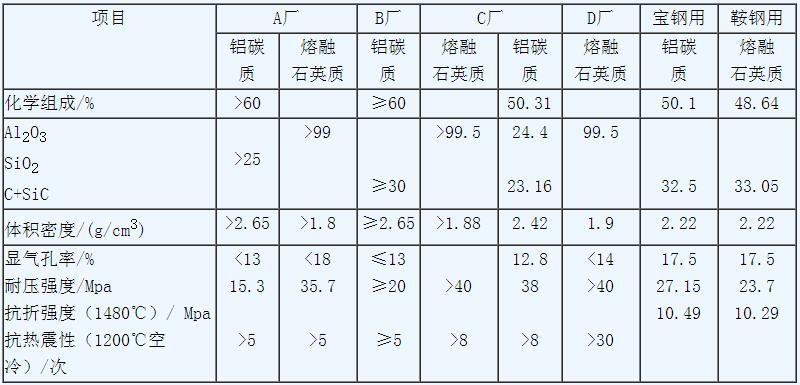 美國1989年開發了鋯英石-氧化鋯質和氧化鋁-氧化鋯質復合水口,使用壽命分別達到21次和16次,1991年日本新日鐵公司以Al2O3-SiC-C質澆注料為基礎,加入人造石墨和碳纖維,生產出用不定形料制作的長水口,均取得良好的使用效果。長水口用耐火材料見表1.