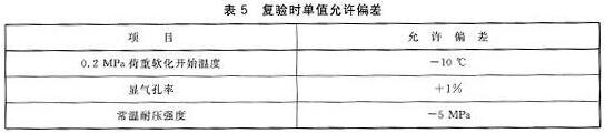 抽樣、驗收按GB/T 10325 進行。顯氣孔率、常溫耐壓強度、荷重軟化溫度為驗收檢驗項目。需要復(fù)檢時,單值允許偏差應(yīng)符合表5的規(guī)定。