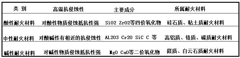 耐火材料的抗渣性主要取決于制品的化學礦物組成,耐火材料按其主要成分的化學性質可分為三類,其分類見表 !。由表1可知,酸性耐火材料可抵抗酸性熔渣,堿性耐火材料可抵抗堿性熔渣。