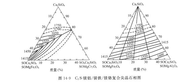 從圖 14-9 可知,C2S-MgO . (Fe, Cr)203 系統的熔點比 C2S-MgO • (Fe, AD2O3系統高200°C左右。由此推知,鎂鉻磚的耐燒蝕性要比鎂鋁尖晶石磚、 鎂鐵尖晶石磚、鐵鋁尖晶石磚好得多。
