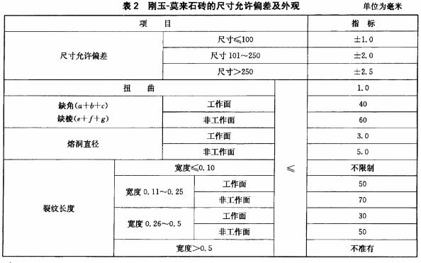 磚的理化指標應符合表1的規定。磚的尺寸允許偏差及外觀應符合表2的規定,預組裝的產品尺寸允許偏差應符合表3的規定。