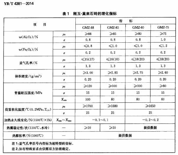 在冶標(YB/T 4381-2014)中規定了剛玉莫來石磚的分類、形狀和尺寸,技術要求,和試驗方法,產品驗收等項目。