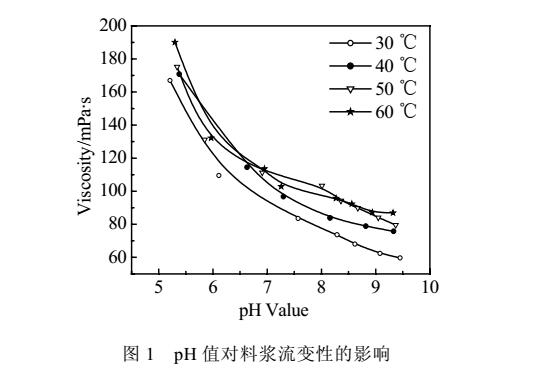 由圖 1 還可以看出,在 pH 值相同的條件下,溫度越高,料漿的粘度越大。盡管具體原因有待進(jìn)一步深入探討,但主要的影響因素可能有: