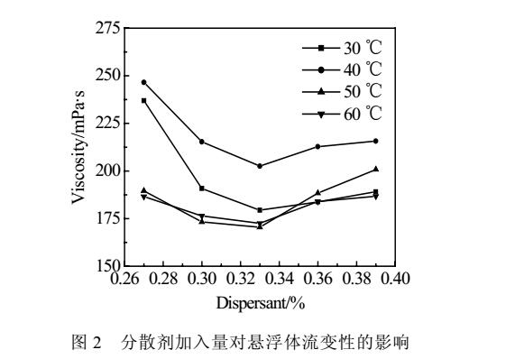 同時(shí)可以看出,在堿性條件下(料漿 pH=9),30, 40 ℃時(shí)分散劑對料漿粘度的影響較大,而 50, 60 ℃時(shí)分散劑對料漿粘度的影響較小,曲線較為平緩,表明高溫下由于聚合作用的發(fā)生,分散劑的作用明顯減小。