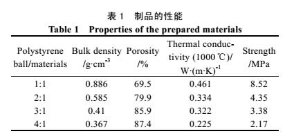 從表 1 可以看出,造孔劑聚苯乙烯球加入量對燒結(jié)后制品密度有顯著的影響。隨造孔劑加入量增加,材料的體積密度減小,氣孔率增大。當(dāng)球料比為 1:1 時(shí),體密為 0.885 g/cm3,氣孔率為 69.5%;當(dāng)球料比為 4:1 時(shí),體密為 0.367 g/cm3,氣孔率為 87.37%。