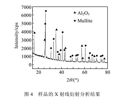 X 射線衍射儀分析材料的物相組成結(jié)果表明:樣品中含有莫來石相 60%、剛玉 20%~30%、金紅石 3%、玻璃相 5%~10%。