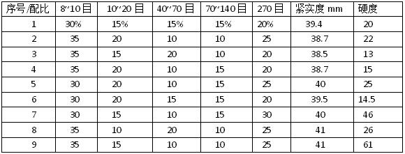 取每一種配比的石英砂300克,混合均勻,倒于抗壓試樣樣筒內(nèi)。然后,在制樣機(jī)上準(zhǔn)確的錘擊5次,記錄緊實(shí)度的大小,取出樣筒,在其底部測(cè)量硬度。記錄備考。在所有記錄中選取緊實(shí)度最大者。
