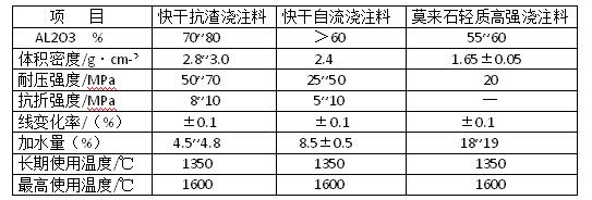 莫來石輕質(zhì)高強澆注料由輕骨料,高溫膨脹填料,結(jié)合劑和外加劑組成,具有密度小,熱導(dǎo)率低和強度高等特點,具有良好的保溫性能。通過下表對比可知,快干抗渣澆注料的體積密度、耐壓強度、抗折強度均比快干自流澆注料要高,同時具有較好的抗渣作用,因此,快干抗渣澆注料更適用于下半部爐墻。