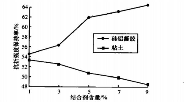 圖1 剛玉—莫來石推板的抗折強(qiáng)度保持率隨結(jié)合劑含量的變化
