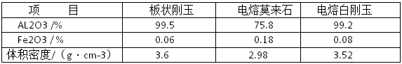 采用莫來石與剛玉為復(fù)合骨料,以電熔白剛玉、電熔莫來石、板狀剛玉及氧化鋁微粉為細(xì)粉,以氧化鋁為添加劑,硅鋁凝膠為結(jié)合劑,與1700℃燒成制得剛玉—莫來石質(zhì)窯具,具體性能如下表所示。