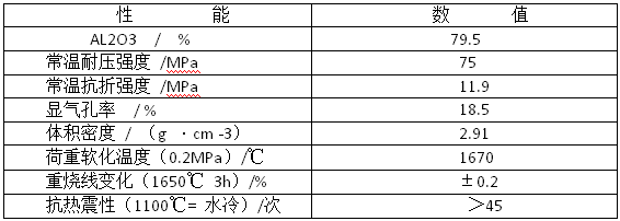 該產(chǎn)品具有高溫強(qiáng)度高、荷重軟化溫度高、重?zé)變化率小以及抗熱震性好等特點(diǎn),經(jīng)1100℃水冷循環(huán)45次后,產(chǎn)品沒有斷裂