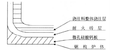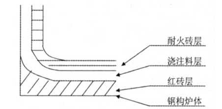 (2)易于修補。耐火澆注料在使用過程中如出現破損,可以將破損處澆筑料去除,并適當擴大到漏出不銹鋼固定鉚釘,然后重新澆筑澆注料。由于有固定鉚釘結合砌筑的澆注料可以和原有澆注料緊密結合。