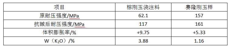 棕剛玉澆注料的抗渣結果為:切開坩堝,無明顯的浸蝕滲透現象。從抗堿試驗來看,剛玉莫來石完全潰散,無一完整的。克隆剛玉樣與棕剛玉澆注料試樣完整無裂紋,其抗堿性試驗結果見表4。棕剛玉澆注料有較好的抗堿性能,但與塞隆剛玉樣相比,抗渣試驗后體積膨脹較大,吸收的K2O也較好。