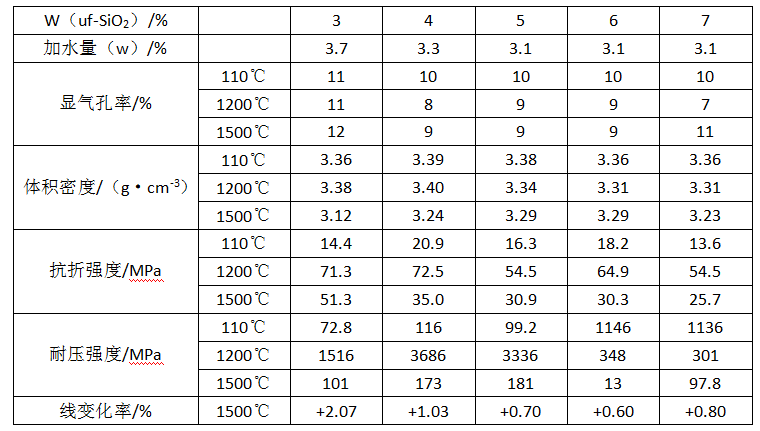 試驗選用埃肯微粉的加入量(w)為3%、4%、5%、6%、7%做對比試驗,試驗結果列與表3。由表3可以看出,當uf-SiO2加入量為3%~4%(w)時,施工用水量較大,燒后線變化也較大,當加入量為5%~7%(w)時,施工用水量較小,各項指標也在目標值內。