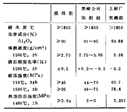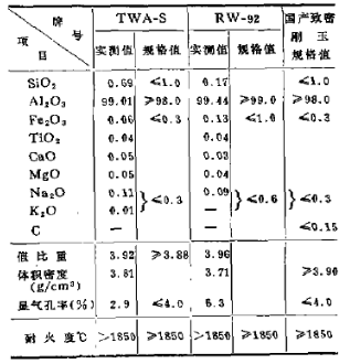 日本黑崎公司配制剛玉質澆注料,采用日本研磨的TWA-S或采用日本昭和電工的RW-92致密電熔剛玉為骨料,這兩種剛玉的技術指標列于表1。