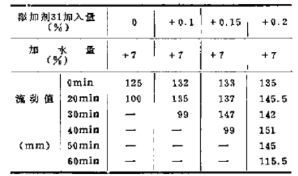 從眾多的無機、有機緩凝劑減水劑中,我們選出了添加劑31,它具有明顯的緩凝與減水作用,見表4。