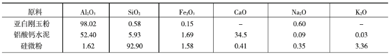 實(shí)驗(yàn)原料研制中選用亞白剛玉顆粒做骨料,采用的是五級(jí)粒度級(jí)配,即1 mm〜3 mm、3 mm〜5 mm、5 mm〜8 mm、8 mm〜12 mm及細(xì)粉,選用鋁酸街水泥作結(jié)合劑,并加入純度達(dá)98%的碳化硅粉以及外加劑硅微粉,硅微粉的添加,主要是代替并減少水泥的用量。為了減少施工加水量并保證有一定的流動(dòng)度,滿足施工要求,外加減水劑三聚磷酸鈉,主要原料的化學(xué)組成見表1。經(jīng)優(yōu)化配方設(shè)計(jì),制備試樣。