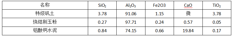 以特級礬土熟料和燒結剛玉為骨料和摻合料,鋁酸鈣水泥為結合劑,外加少量減水劑和一定比例的耐熱鋼纖維。主要原料的理化性能見表1。
