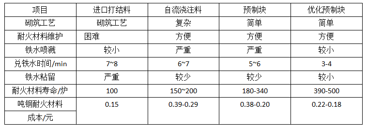 表1 兌鐵槽耐火材料使用效果兌換表