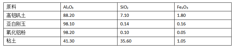 主要原料為高鋁礬土、亞白剛玉、氧化鋁粉、結(jié)合黏土,其成分和物料粒度見(jiàn)表1,2。