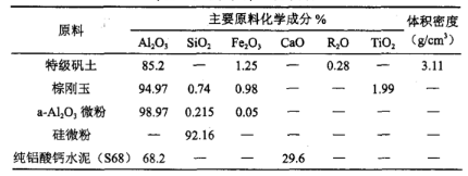 由于SiO2含量較高的材料容易與鋁及鋁合金發生反應,對這類耐火才老侵蝕嚴重,因此選用了Al2O3含量較高的一批材料,以提高澆注料的抗鋁水滲透能力。實驗主要原料:優質特級礬土、棕剛玉、α-Al2O3微粉、硅微粉、鋁酸鈣水泥、外加劑等。