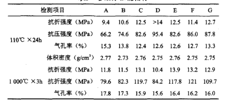 C、D兩組主要比較水泥量多少對強度指標的影響。通過大量實驗數據表明,常溫下試樣的強度主要由純鋁酸鈣水泥提供,水泥加入量越多則強度越高;但經過高溫處理后,鋁酸鈣水泥加入量多的,燒后強度下降厲害;而加入量較少的,燒后強度則明顯提升。一般水泥加入量在7%左右為臨界點,少于7%的燒后強度一般為增加,高于7%時燒后強度則開始下降。綜合考慮施工因素,水泥量加入太低會影響脫模時間、脫模強度、常溫強度等,純鋁酸鈣水泥最終加入量確定為6%。