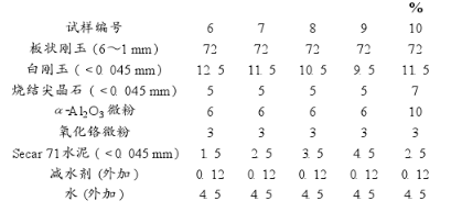 采用的原料為板狀剛玉、電熔白剛玉、工業氧化鉻微粉(Cr203含量98.5%)、α-Al203微粉(Dm≈4um)、Secar71水泥和燒結尖晶石粉(Al203含量76%,MgO含量23.5%)。