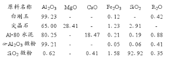 實驗所用主要原料化學(xué)組成見表1。抗渣實驗用渣的化學(xué)成分見表2。澆注料實驗技術(shù)路線:原料→配合→昆合→成型→干燥→險測。