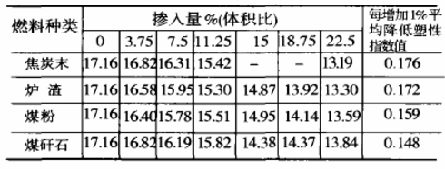 從上表試驗(yàn)結(jié)果中可以看出如下規(guī)律:(1)隨燃料摻入量的增加,粘土塑性指數(shù)也隨之降低,兩者為反比關(guān)系。(2)塑性指數(shù)的降低率與粘土原有的塑性有關(guān),粘土塑性越高,則受摻入燃料的影響越大,即降低率越高。(3)塑性指數(shù)的降低率和燃料的種類有關(guān),燃料中的灰分越高影響越大。綜上所述,可塑性高的粘土,適合選用熱值低的燃料;反之塑性低的粘土宜選用熱值高的燃料,摻入燃料數(shù)量的多少是以熱值為依據(jù)的。因此,應(yīng)對(duì)燃料進(jìn)行認(rèn)真地工業(yè)分析,隨時(shí)掌握進(jìn)廠煤種的發(fā)熱量和波動(dòng)范圍,從而及時(shí)調(diào)整配料制度。