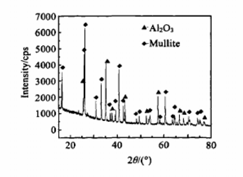 樣品主晶相為莫來石(80%),還含有少量的剛玉相(15%),玻璃相很少(5%左右)。大量莫來石相存在,使材料均有良好的耐高溫性能和抗熱震性能。剛玉相增強了材料的高溫耐火性能,提高材料的適用溫度范圍。少量玻璃相的存在,既有利于提高燒結驅動力,獲得致密的、室溫強度較髙的材料,又有利于使燒結后材料內莫來石相和剛玉相形成高溫固相直接結合結構,對提高材料的高溫強度非常有利。