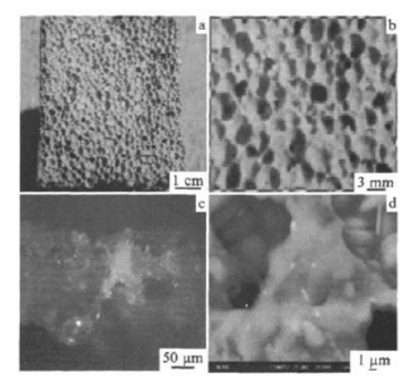 取球料比為4:1的樣品進行結構分析。燒成后材料呈淺黃色,沒有明顯缺陷和大的氣孔。孔壁薄如蟬翼,肉眼已無法判斷其厚度(圖3a)。孔洞與孔洞之間絕大多數互不連通,只有少數孔壁有孔,使相鄰孔洞連通(圖3b),這表明盡管孔壁很薄,但孔壁的分布十分均勻,材料組織結構比較均勻。在光學顯微鏡下(圖3c),制品的孔壁最薄處200~300um,三孔交界處300〜400um。在電子顯微鏡下觀察(圖3d),孔壁上晶粒細小,直徑在2~4um,結合緊密,孔壁上還有一些封閉氣孔。可以認為這些氣孔應該是基質中的結合劑燒失后留下的氣孔,在高溫下強化燒結并進一步封閉形成的。