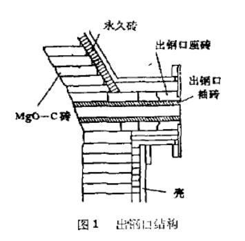 加古川制鐵所煉鋼廠的240噸轉爐出銅口基由MgO-C質的出鋼口座磚和袖磚構成的。圖1表示出鋼口的構造。袖磚以往的壽命為80〜90爐次,出鋼時間如果比規定時間短,就要清除殘留的袖磚,換新的袖磚,這種更換作業以往需要長達50〜55分鐘的時間。圖2 表示轉爐非運轉時間明細。由于換袖磚的作業時間1天平均礙要43分鐘左右,因而是導致連鑄中斷、轉爐作業率低的主要原因。