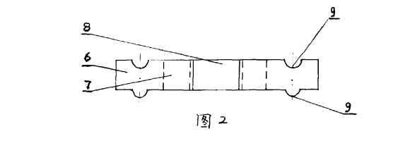 圖1、2中,6—專用異型耐火磚的整體,7-異型磚整體6上的中心通孔,8—異型磚整體6外側面的凹槽、凸起,9—異型磚整體6上、下表面的凹槽、凸起。本實例在使用時可由數個專用異型磚的整休6通過其外側面的凹糟、凸起8相亙咬合物成導風 墻4 (附圖3中)的一層,再由若干專用異型磚的整體6通過其上、下表面的凹槽、凸起相互4合砌成導風墻4 (附圖3中)的若干層,這樣就徹筑成有數個導風孔的堅爐導風墻。