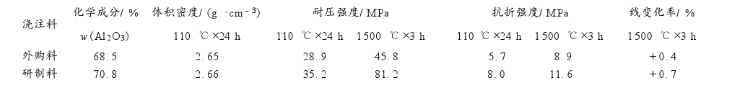 根據澆注料研究的內容以及選擇的原材料,首先進行了澆注料的配方設計,通過實驗室的配方調整,獲得了抗熱震性與防爆性較好的澆注料配方,并采用外購料與研制料分別制備40mm×40mm×160mm的試樣進行力學性能對比檢測。由試樣的成型過程可知,研制的澆注料粘度比外購料稍大,振動返漿時間稍長。表2為研制的耐火澆注料與外購澆注料的理化性能檢測結果。同時在實驗室中進行了兩種澆注料的1100℃水冷熱震對比試驗,對比試驗結果為外購料的熱震循環13次時,試樣表面出現微裂紋,45次時試樣已有大塊剝落,研制料試樣則在15次時表面出現裂紋,62次時出現與外購料同樣的剝落狀況。