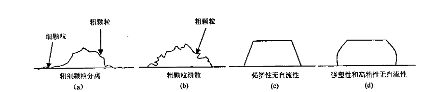 當顆粒組成處于1區(qū)時,會出現粗細顆粒偏析現象,見圖3(a)。當處于2區(qū)時,會出現粗顆粒潰散現象見圖3(b)。當處于3區(qū)和4區(qū)時會出現強塑性狀態(tài)見圖3(c)、(d)。只有處于5區(qū)時才具有自流性能。