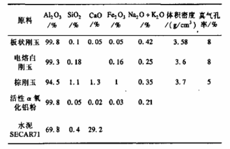 試驗所用的原料主要有板狀剛玉、電熔白剛玉、棕剛玉、活性α氧化鋁,純鋁酸鈣水泥SE-CAR71,外加劑等。主要原料的化學成分見表1。