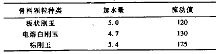 (2)當采用不同檔次的顆粒骨料時,要達到相同的流動值,以采用電熔白剛玉時加水量最少,加水量4.7%即可達到施工要求。