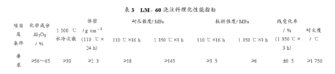 根據(jù)上述澆注料的實(shí)驗(yàn)研究情況,根據(jù)鍛造加熱爐爐門澆注料性能要求的分析結(jié)果,確立了爐門澆注料相應(yīng)的理化性能要求,具體如表3所示。澆注料牌號命名為LM-60。
