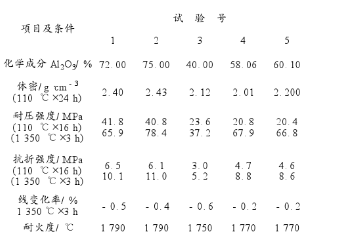 根據(jù)上述的原材料選擇原則與澆注料性能改進(jìn)思路,按照澆注料中Al2O3的含量不同進(jìn)行了多個(gè)配方設(shè)計(jì),并在實(shí)驗(yàn)室進(jìn)行了配方調(diào)整實(shí)驗(yàn)及抗熱震性實(shí)驗(yàn)。按照實(shí)驗(yàn)預(yù)定的高抗熱震性技術(shù)要求,確定了5個(gè)性能優(yōu)良的澆注料配方,分別制成40mm×40mm×160mm的試樣進(jìn)行詳細(xì)的理化性能檢測,具體檢測結(jié)果如表2