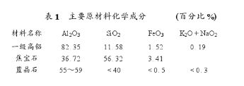根據(jù)上述鍛造加熱爐爐門破損原因分析,再結(jié)合現(xiàn)有相關(guān)澆注料技術(shù)的基礎(chǔ)上,認(rèn)為通過合理選擇澆注料的原材料,組分配比的調(diào)整和外加劑的研究,可以改善爐門澆注料的使用性能,達(dá)到提高爐門使用壽命的目的。為此,在爐門澆注料的原材料選擇方面進(jìn)行了相應(yīng)的研究和分析。選取了耐火度、抗熱震性及高溫沖刷性能優(yōu)良的特級焦寶石和一級高鋁熟料作為澆注料的骨料,以改善澆注料的高溫性能。從改善澆注料的常溫和高溫結(jié)合強(qiáng)度、體積穩(wěn)定性等方面考慮,選取一級高鋁粉為澆注料的主要粉料。從改善澆注料抗熱震性、防爆型和降低密度等方面考慮,選取了力學(xué)性能與抗高溫粉化性能優(yōu)良的無機(jī)高鋁纖維為防爆、增加添加劑。此外,為了滿足鍛造加熱爐爐門澆注料的使用性能和其他相關(guān)的使用性能,選擇了多種有機(jī)與無機(jī)減水劑、分散劑為復(fù)合外加劑。澆注料主要原材料的理化性能如表1所示。