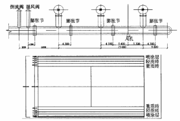 混風室中心線到1#熱風爐三岔口中心線10.8m,1#與2#、2#與3#熱風爐三岔口中心線15m。熱風總管外徑3.200m,內徑2.096m。爐皮厚度16mm,噴涂層50mm,纖維氈10mm,輕質磚采用三層,每層輕質磚厚度114mm,重質磚采用一次環砌,重質磚厚度152mm。