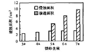 隨鎂砂細粉含量增加,渣蝕面積隨之增加。鎂砂細粉含量為3a~4a時,增加的幅度較小;鎂砂細粉含量為5a~ 7a時,渣蝕面積增加幅度較大(主要是滲透加劇);鎂砂細粉含量為6a~7a時,侵蝕面積變化不明顯,但滲透面積增加很快。