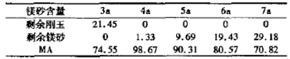 表4為試樣的基質中鎂砂細粉與剛玉細粉完全反應生成理論尖晶石基質的成分?梢姡V砂細粉含量為3a、4a時,因基質中鎂砂細粉與剛玉細粉在1400℃左右已經反應完全,故在更高溫度下僅為燒結收縮起作用,在1600℃燒后呈現收縮;而M5、M6、M7在以后的溫度下剩余的鎂砂細粉仍然與骨料中的剛玉發生反應,繼續產生膨脹,抵消了部分燒結收縮而呈現處或多或少的膨脹,隨鎂砂細粉含量增加,膨脹顯著增加。