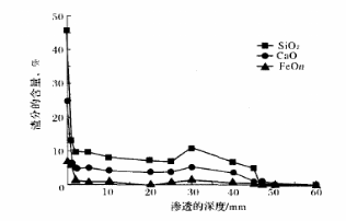 熔渣對耐火磚的其實主要包括3個過程,即滲透、溶解和沖蝕磨損。煤中含有的Si、Al、Ca、Fe及其他微量金屬鹽類構成了煤的成分,不同的煤種可形成不同種類的熔渣,熔渣通過對磚的熔解、滲透并在氣化爐內強還原氣氛下雨耐火磚的組分形成低熔點化合物,改變了磚的組成,低熔點化合物不斷地被沖刷,導致耐火磚被逐漸剝蝕。實踐證明,CaO含量高的熔渣在高溫下與其他組分發生程度不同的反應,形成新的低熔物相,較SiO2含量高的爐渣對Cr2O3基耐火材料的滲透侵蝕性更強(見圖2),引起的結構剝落次數和厚度變化更加嚴重。