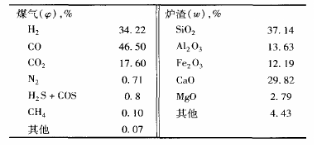 煤氣化爐操作條件為爐膛溫度不大于1400℃,操作壓力6.5MPa,煤漿濃度58%~64%,煤漿灰熔點小于1300℃,入爐煤量31.25t/h,排灰渣量4.2t/h。操作溫度控制在煤灰的灰熔點之上50℃,產生的渣呈液態沿耐火磚向火面留下,因而與耐火磚接觸的介質為高溫煤氣的熔渣(組分見表2)。從熔渣組分可以看出,煤氣爐產生的熔渣為高鈣渣。